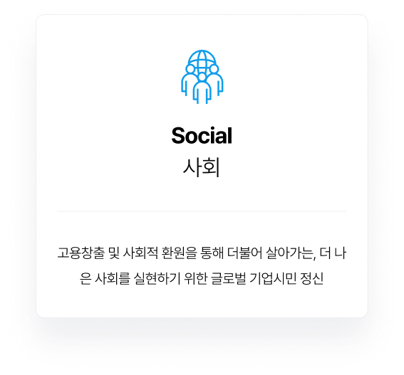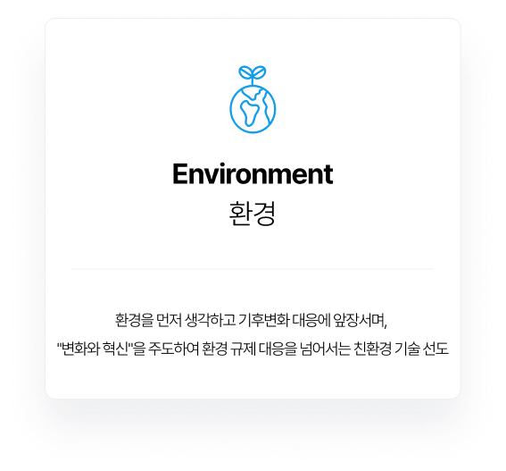 한국메이드는 지속가능경영의 실천을 통해 기업가치 창출과 글로벌 경쟁력을 강화하기 위해 ESG경영을 적극 실천하고 있습니다.친환경 기술 확보 등 환경보전의 가치를 중심으로 기후변화에 대응하고, 노사 화합과 협력사 동반성장, 지역 사회 공헌을 통해 상생협력 활동을 이어가고 있습니다.