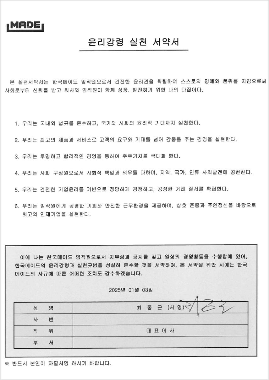 우리는 ‘신뢰’와 ‘열정’의 핵심가치를 바탕으로 고객, 주주, 임직원, 협력회사, 지역, 국가, 인류사회에 공헌하는‘깨끗하고 신뢰받는 기업’을 지향한다. 이에 우리는 깨끗하고 신뢰받는 윤리적인 기업문화 조성에 책임과 역할을 다하고자 한국메이드 윤리헌장을 제정하여 우리의 행동과 가치판단의 기준으로 삼는다.