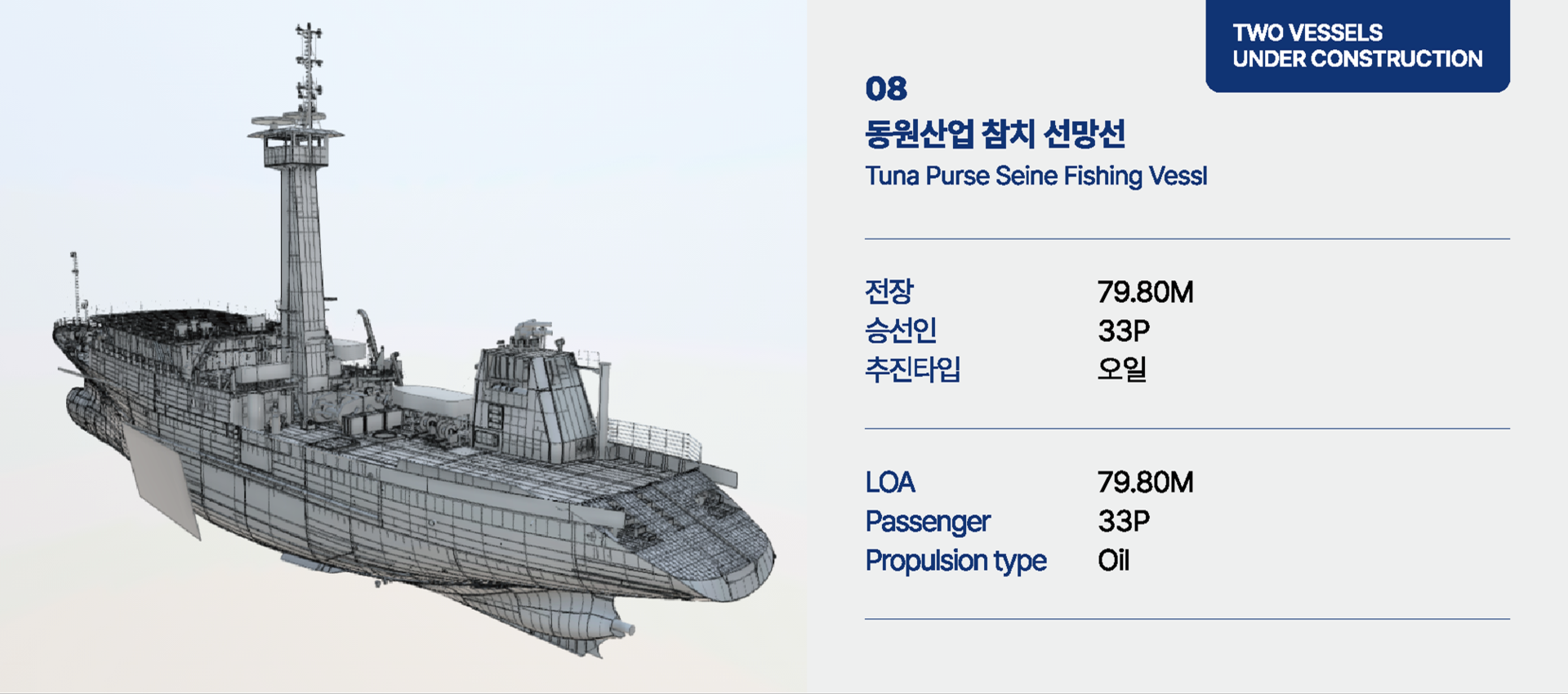 한국메이드는 중·소형 선박 건조에 특화된 신조사업부 인력을 보유하고 있습니다. IMO 환경규제에 발빠른 대응을 넘어서, 친환경 대체연료 해상 테스트 연구선을 건조하였으며, 현재는 동원산업 '참치선망선' 2척을 건조 중입니다.