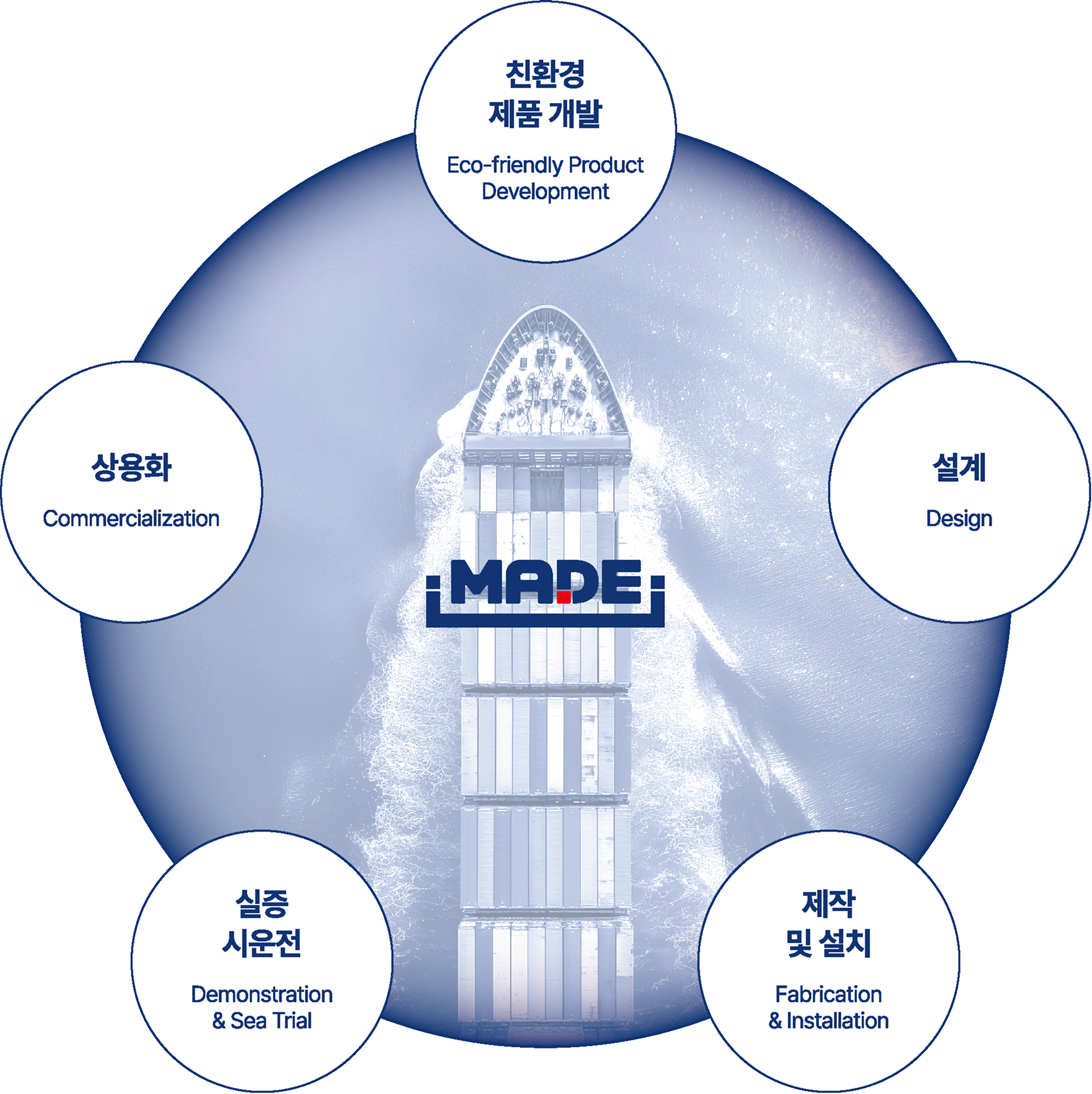 한국메이드 기업부설연구소는 친환경 선박기술을 중심으로 신조·수리·블록 사업 전반의 연구개발을 수행하고 있습니다. 지역 대학 및 연구기관과 협력하여 다양한 R&D 과제를 진행하며, 개발에서 실증, 상용화까지 전 과정을 책임집니다